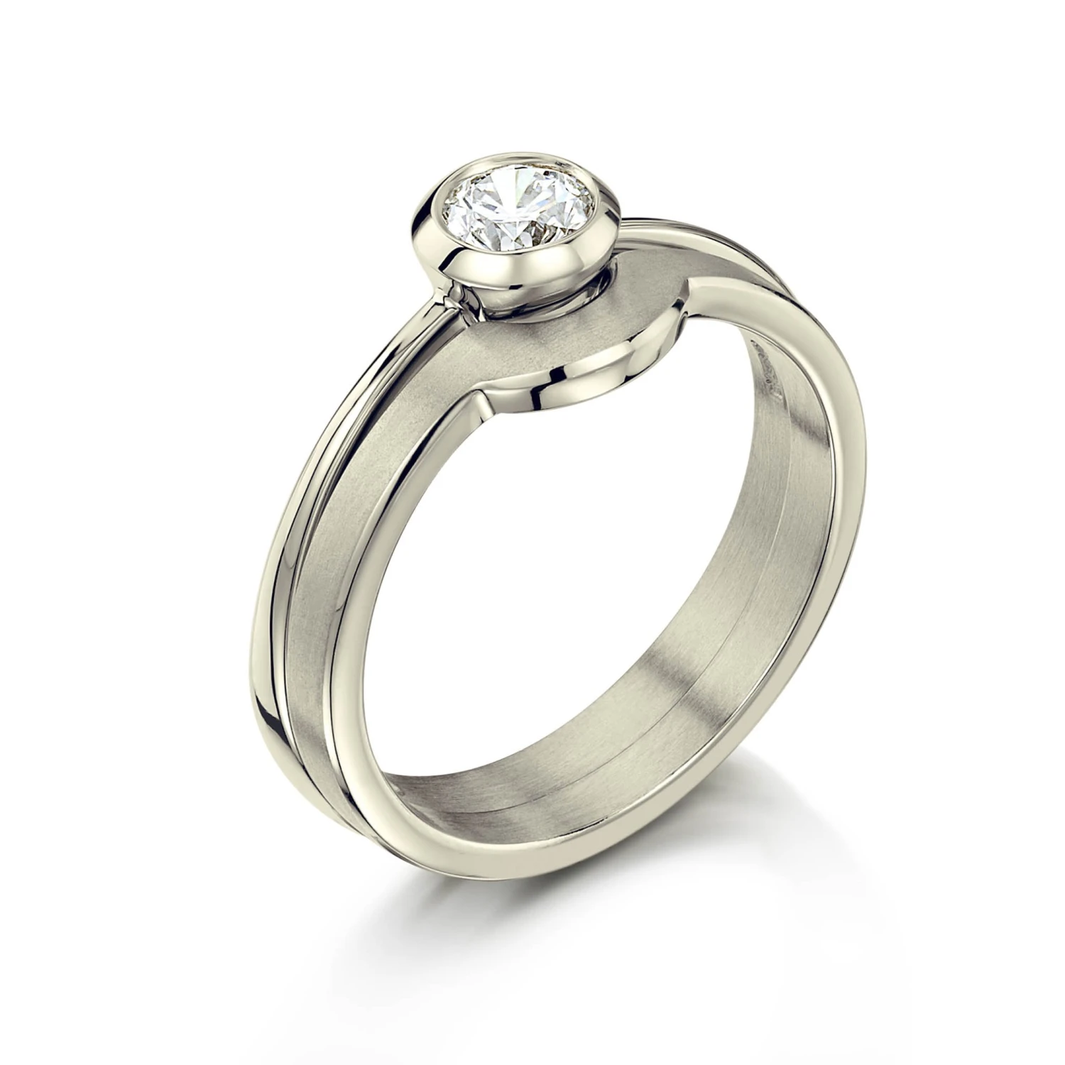 This ring set combines Sheila’s Contemporary Diamond 0.40ct Solitaire ring with her Arch wedding band, both rings beautifully hand-finished in our Orkney workshop. The solitaire ring in elegant 9ct white gold features a sparkling 0.40ct/4.8mm brilliant cut diamond, beautifully complemented by the matching Arch band, also in 9ct white gold.