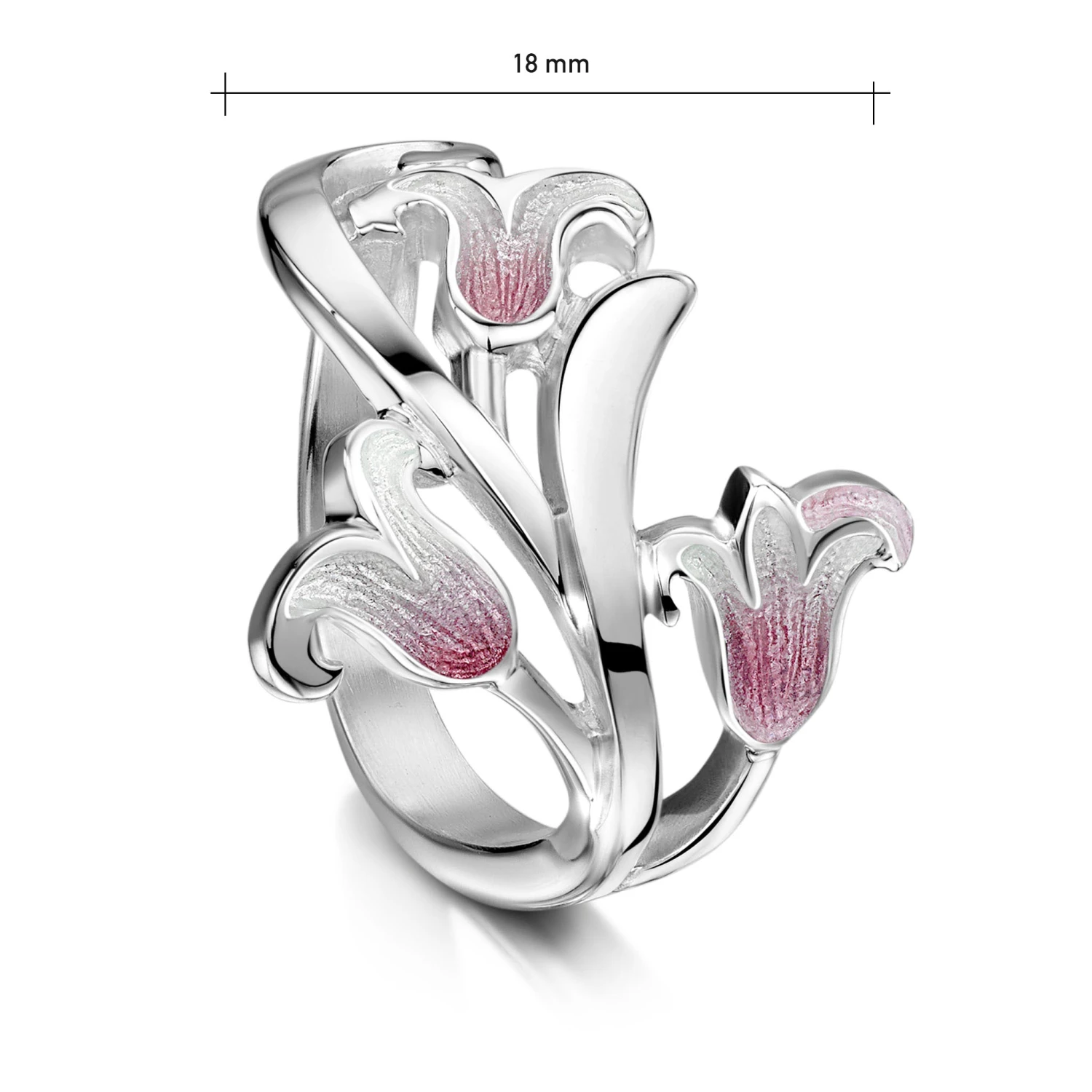 This Bluebell ring in sterling silver features three delicate flowers, each hand-enamelled in ‘Pinkbell’ enamel in our workshop in Orkney.