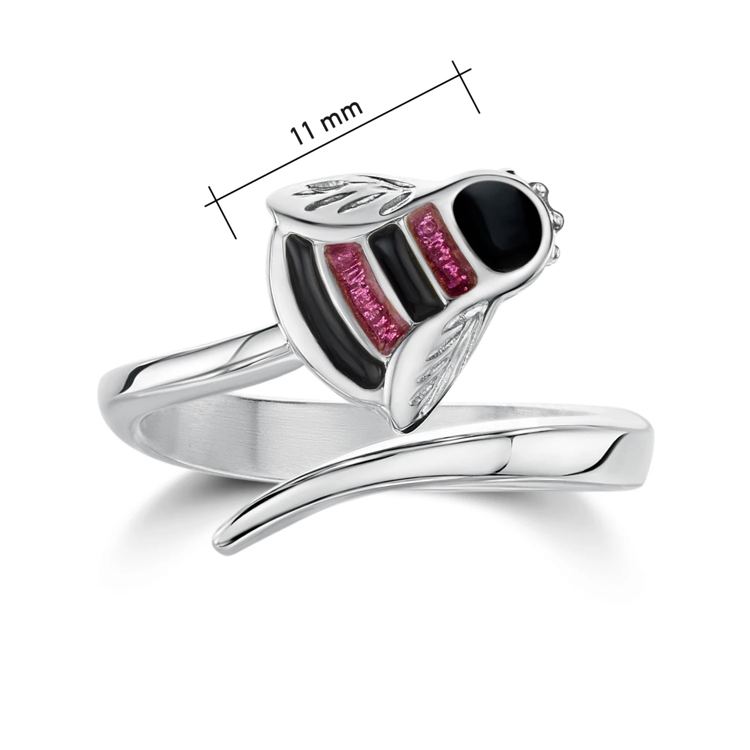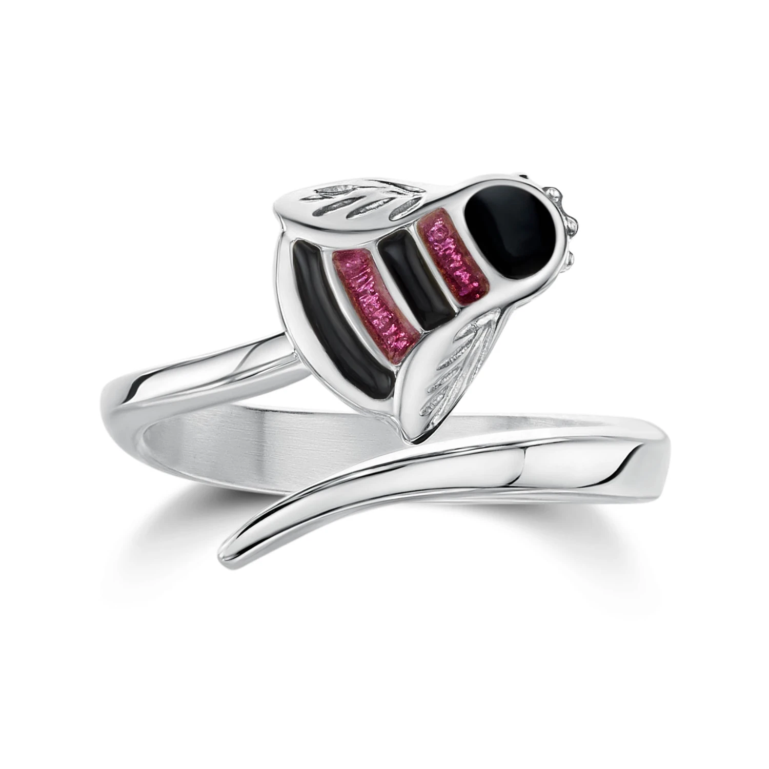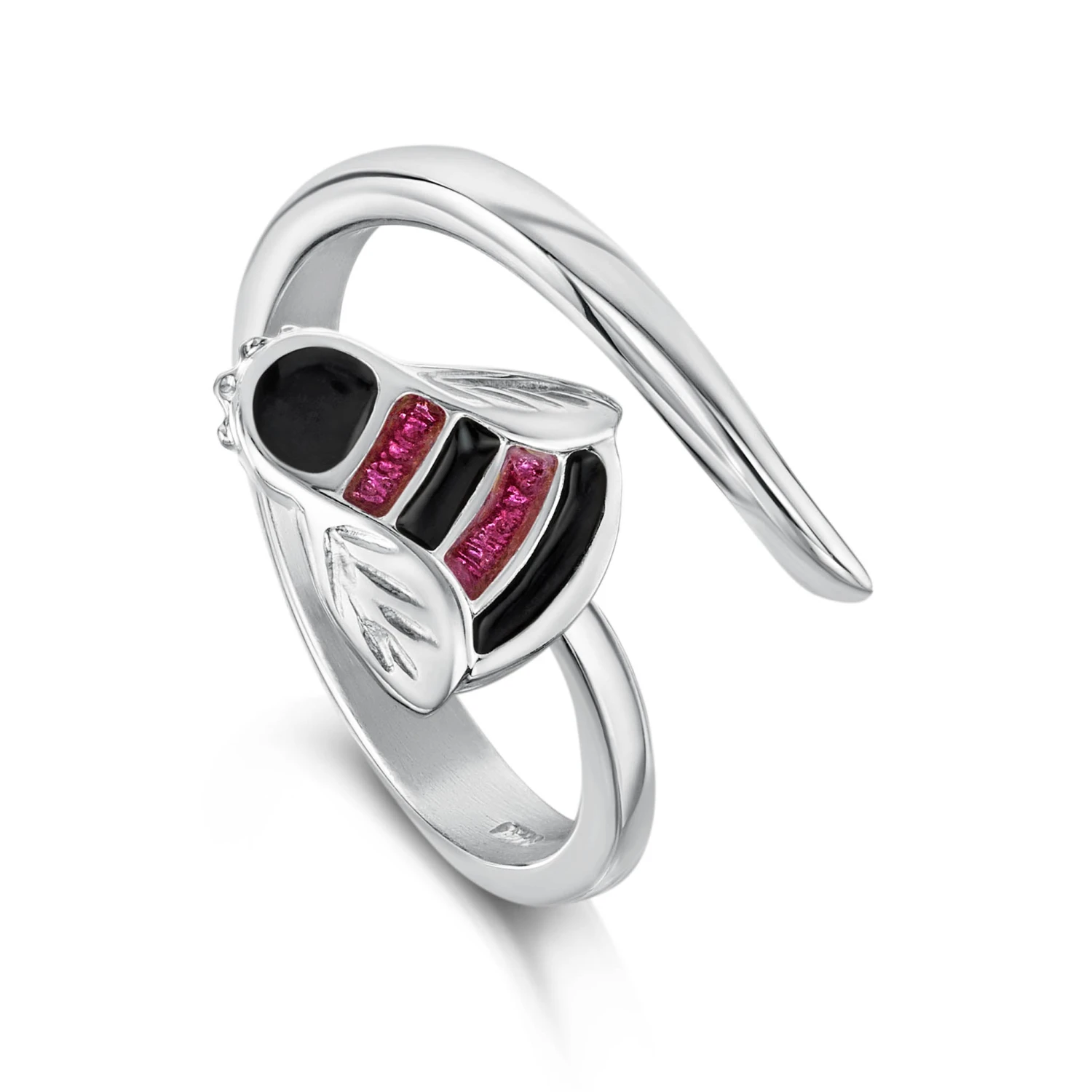 This Bumblebee ring in sterling silver features a cheerful bee in vibrant Hot Pink enamel. The enamelled bee adorns a sterling silver open band that curls beautifully around the finger. The bee measures approximately 11mm long and the ring width tapers from 1.7mm–3mm.