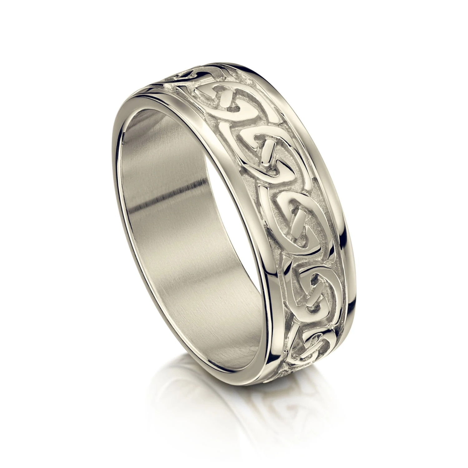 This Celtic Knotwork Ring in 18ct white gold features an interlacing knot design.