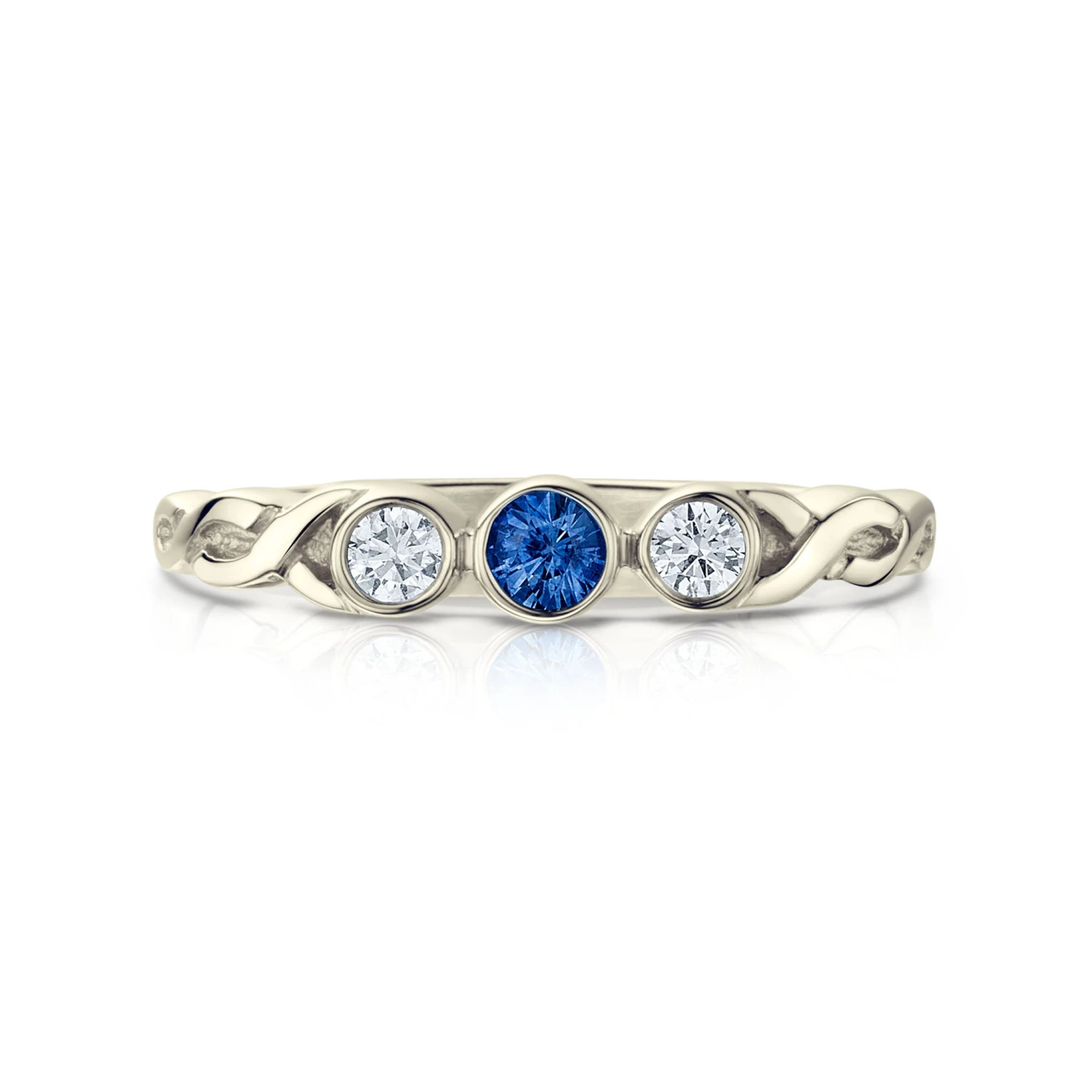This Celtic Trilogy ring in classic and elegant 9ct white gold has an interweaving design, enhanced with three stunning gemstones—a sparkling 2.8mm sapphire flanked by two 2.4mm diamonds.