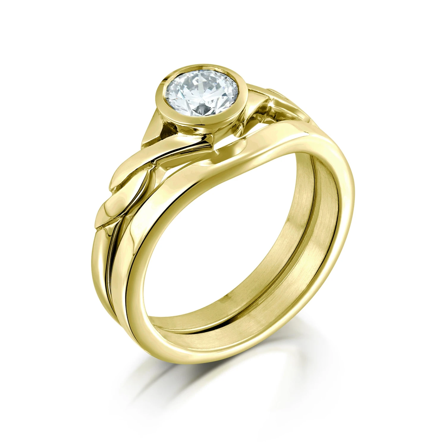 This ring set combines Sheila’s Celtic Twist 0.40ct diamond ring with her Contemporary Curve wedding band, both rings beautifully hand-finished in our Orkney workshop. The Celtic Twist ring in luxurious 18ct yellow gold has an elegant, interwoven design, enhanced with a hand-set 4.8mm brilliant-cut diamond. This intricate diamond ring is complemented by the simplicity of the matching band.