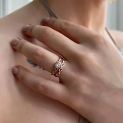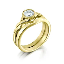 This ring set combines Sheila’s Celtic Twist 0.40ct diamond ring with her Contemporary Curve wedding band, both rings beautifully hand-finished in our Orkney workshop. The Celtic Twist ring in warm 9ct rose gold has an elegant, interwoven design, enhanced with a hand-set 4.8mm brilliant-cut diamond. This intricate diamond ring is complemented by the simplicity of the matching band.