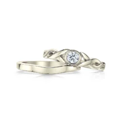 This ring set combines Sheila’s Celtic Twist 0.09ct diamond ring with her Celtic Twist band, both rings beautifully hand-finished in our Orkney workshop. The Celtic Twist ring in elegant white gold has an interwoven design, enhanced with a hand-set 2.9mm brilliant-cut diamond. This diamond ring is complemented by the interwoven design of the Celtic Twist band.