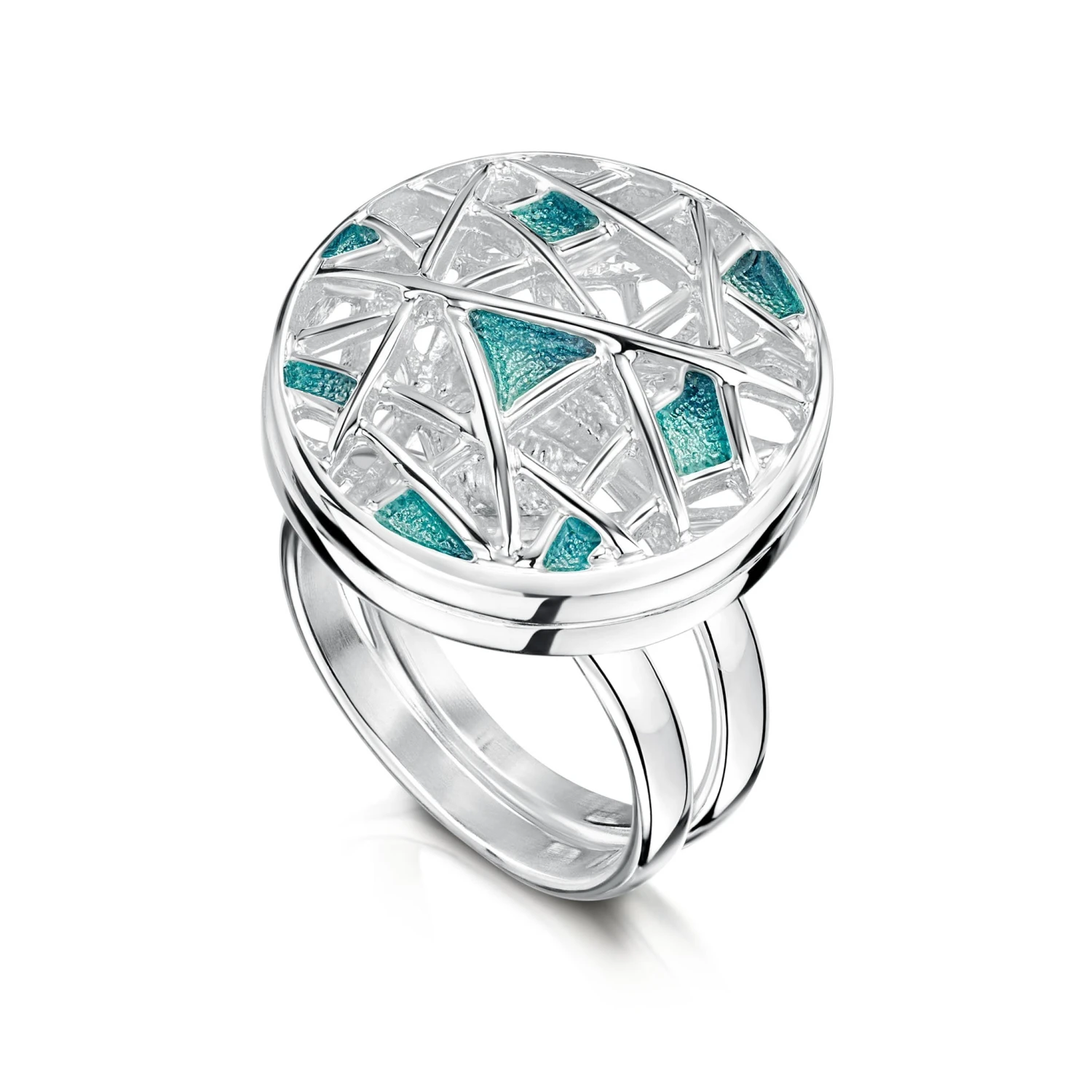 This enamelled sterling silver Creel Cage Ring mimics the pattern of fishermen’s creels, the ‘Storm’ enamel representing trapped sea water. Silver strands on the front and back of the piece combine and curve to form an elegant cage. A solid silver Groatie Buckie is held inside, free to move within.