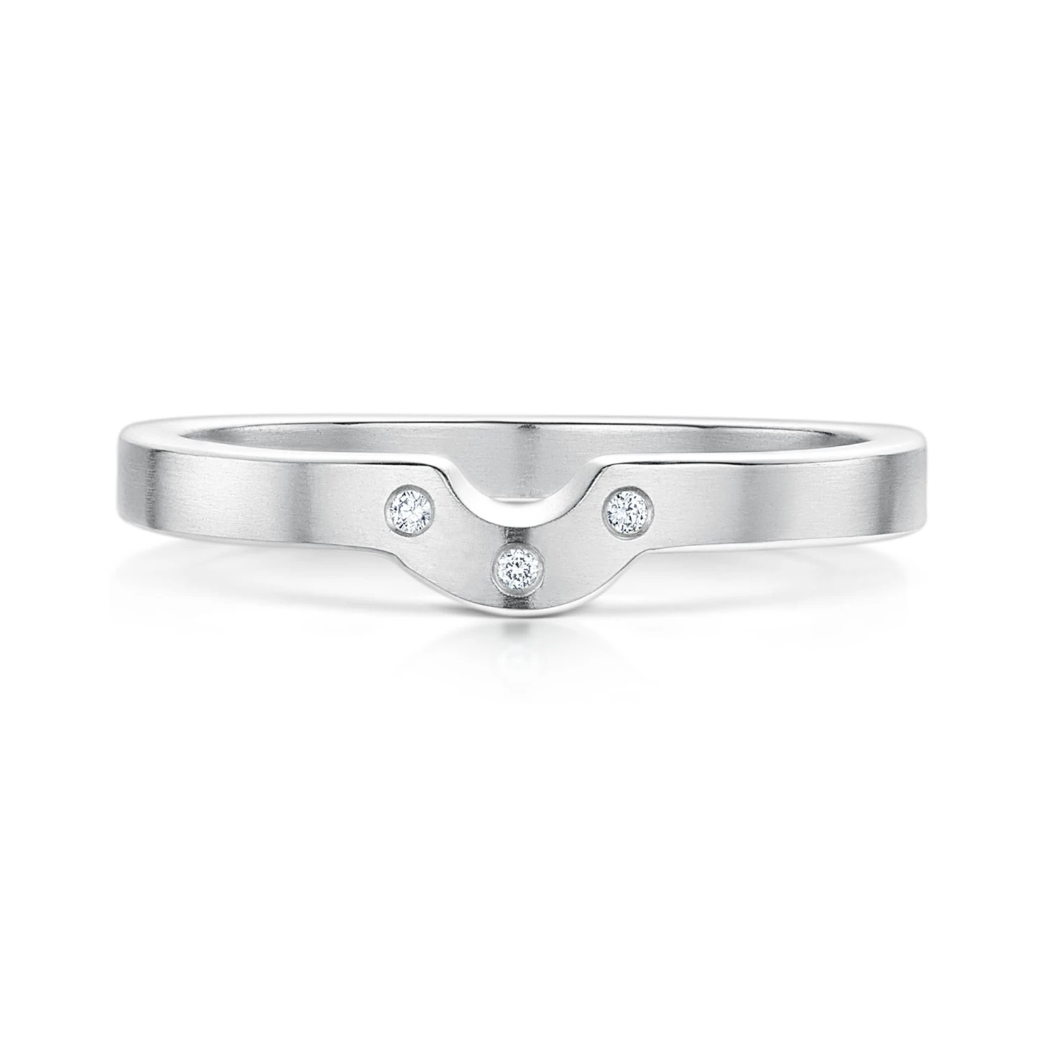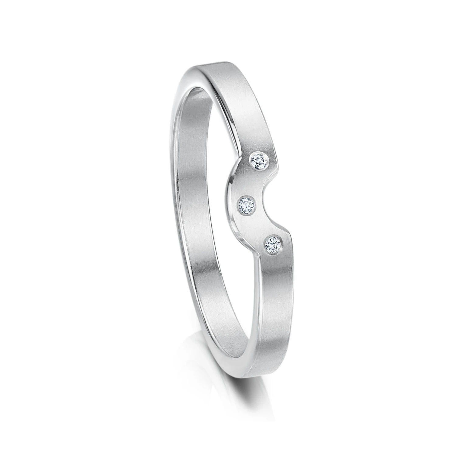 A wedding band with striking arch shape in sterling silver, enhanced with three 1mm sparkling cubic zirconia. This ring is a perfect match for Sheila’s Contemporary 4mm CZ Solitaire Ring in Sterling Silver.