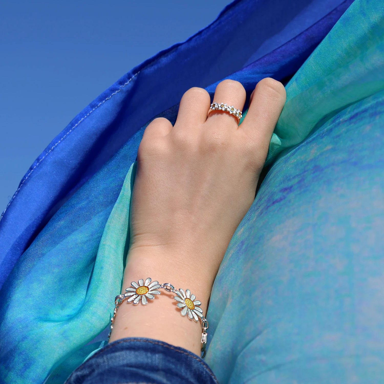 This Daisies at Dawn ring in sterling silver features four petite daisies adorning the face of a silver band. The design is hand-enamelled in our Orkney workshop in ‘Sunshine’ enamel.