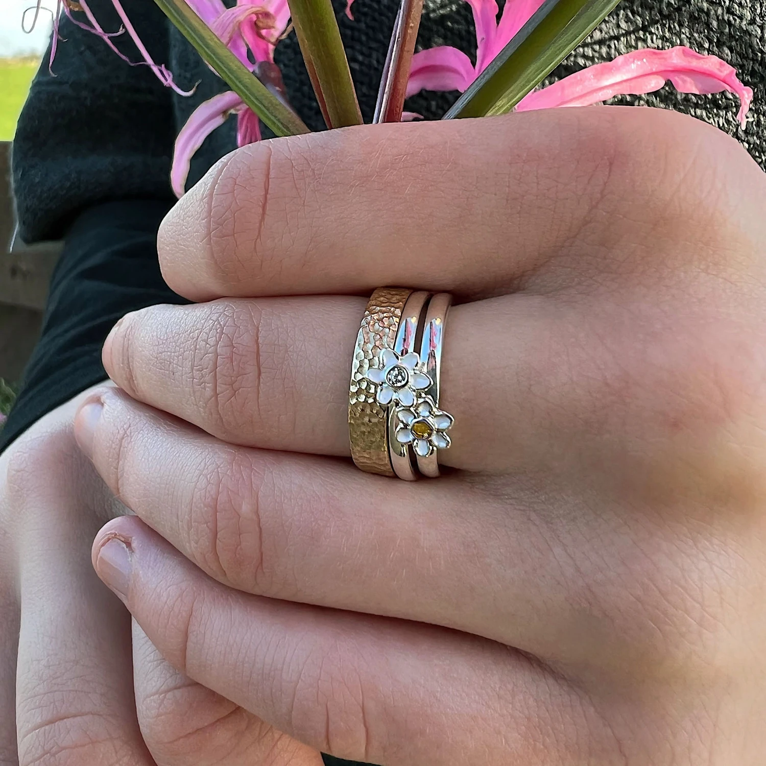 This Daisies at Dawn ring in sterling silver features a petite daisy design on a silver band. The design is hand-enamelled in our Orkney workshop in ‘Sunshine’ enamel.