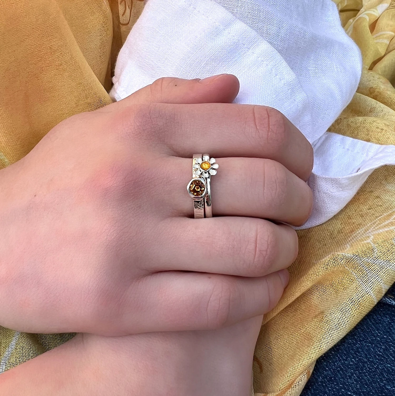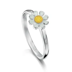 This Daisies at Dawn ring in sterling silver features a small hand-enamelled daisy on a silver band and is hand-finished in our Orkney workshop.