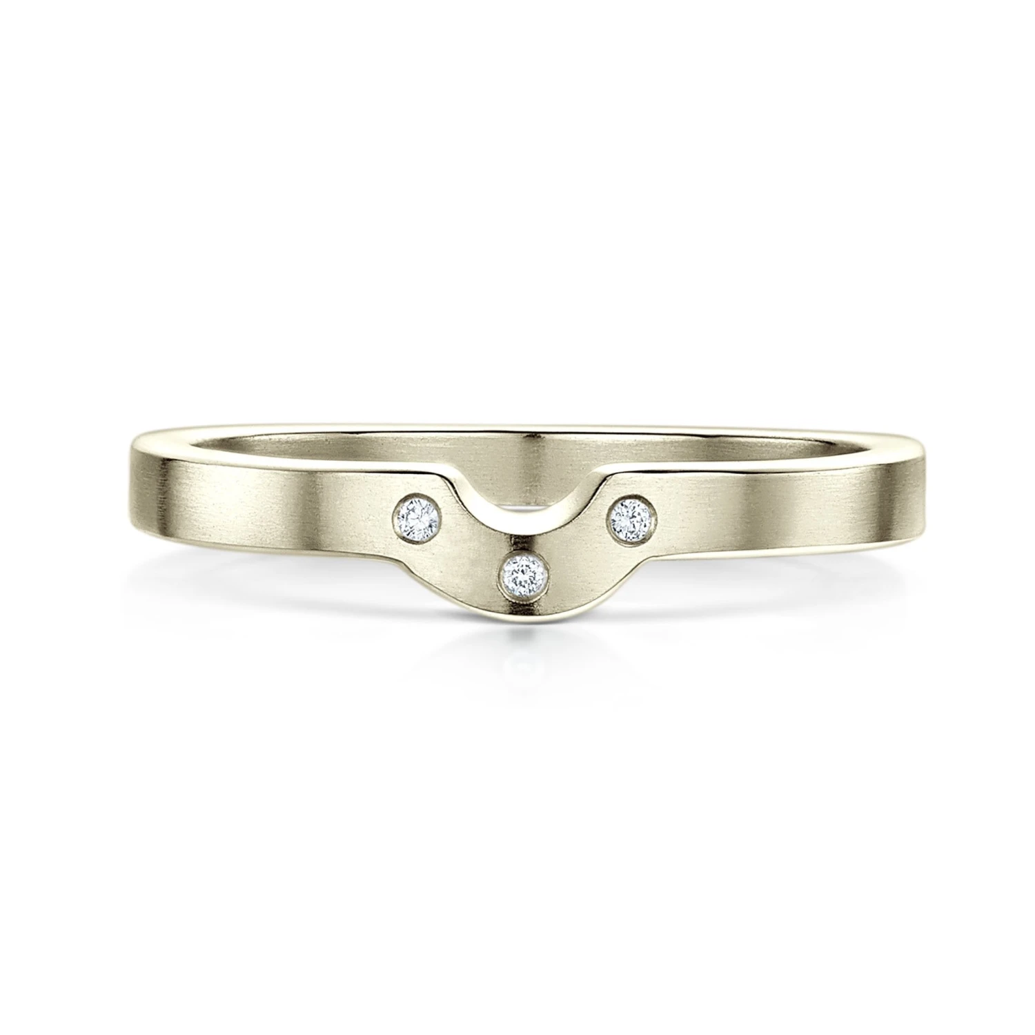 A wedding band with striking arch shape in luxurious 18ct white gold and enhanced with three 1mm sparkling diamonds. A perfect match for Sheila’s Contemporary 0.25ct Solitaire Diamond Ring.