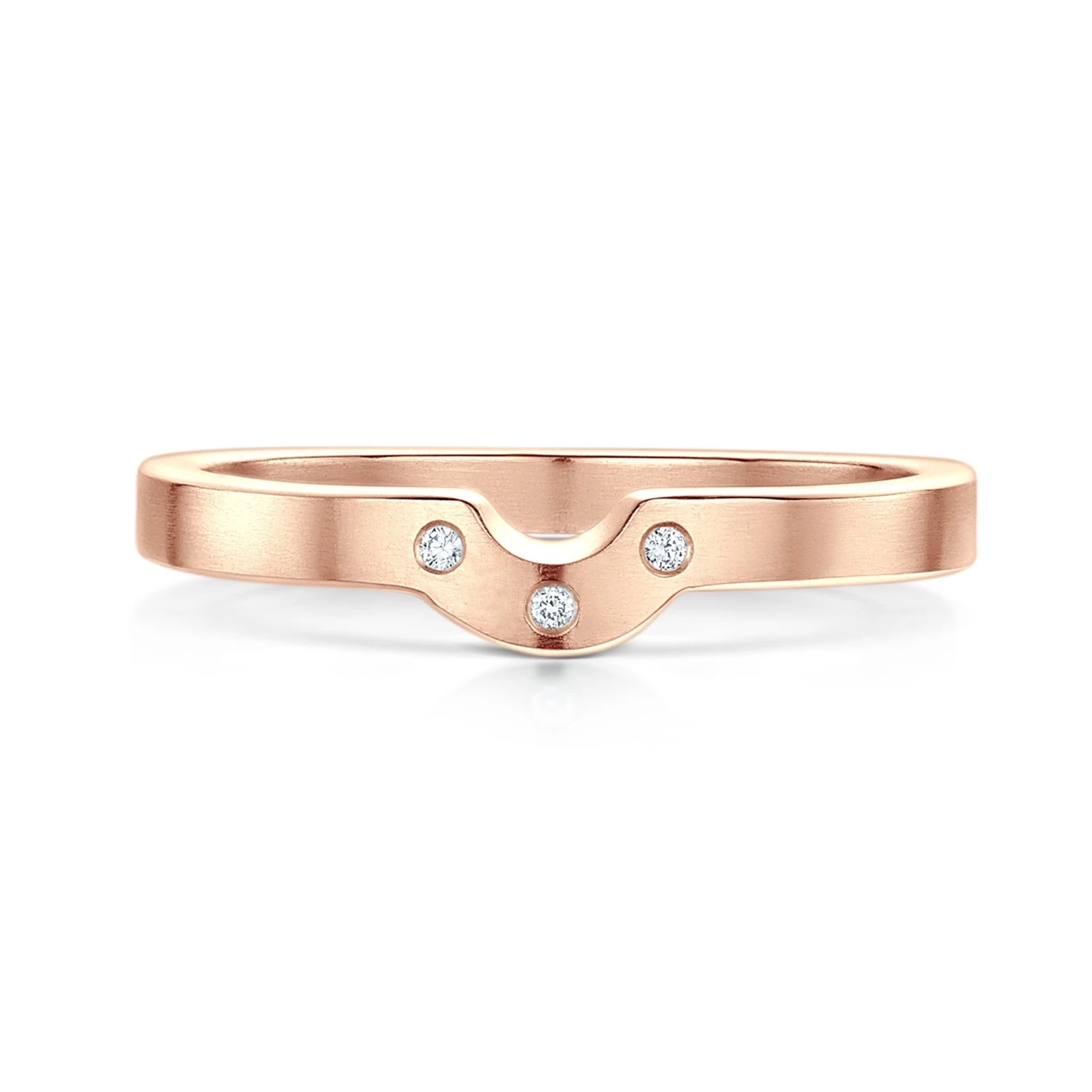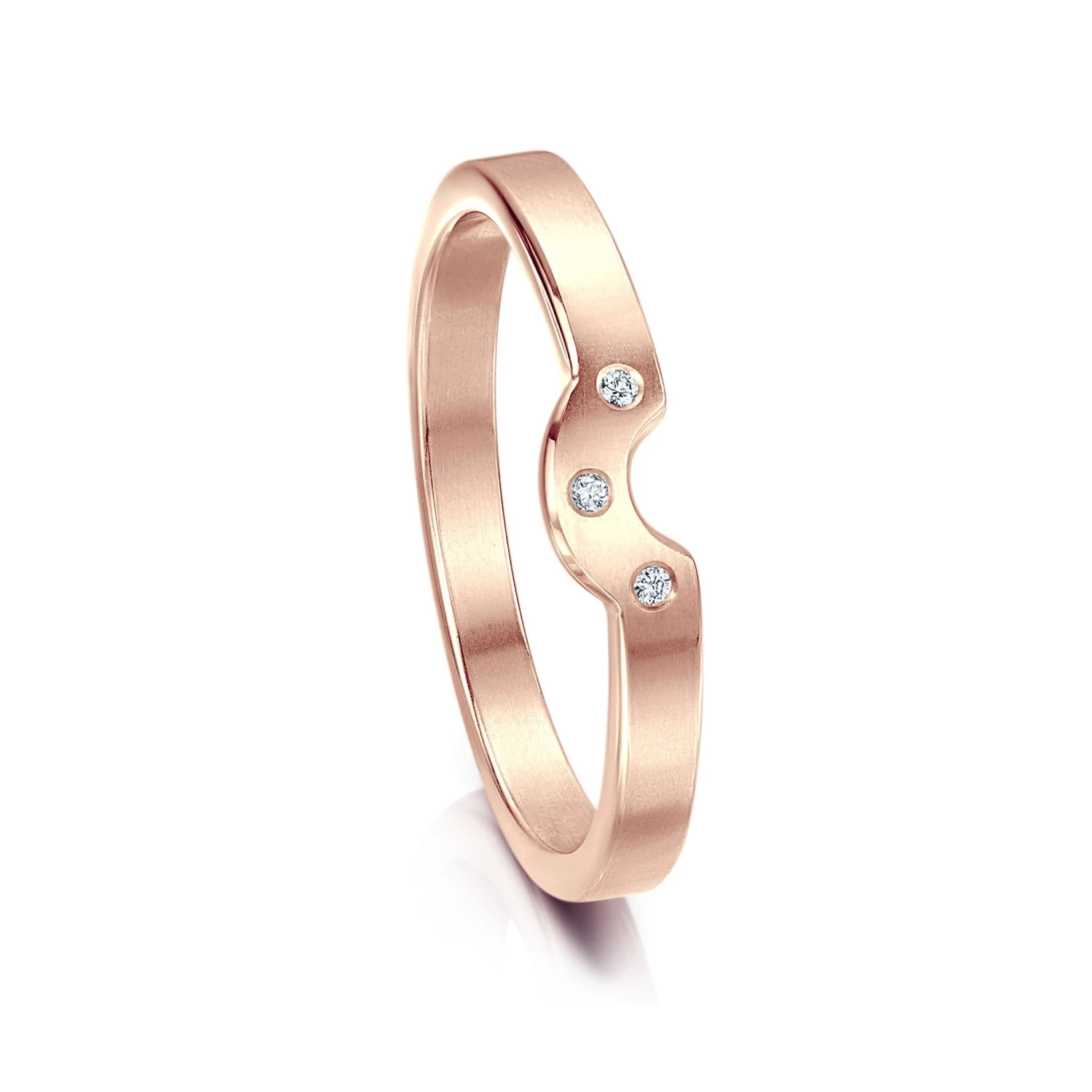 A wedding band with striking arch shape in warm 9ct rose gold and enhanced with three 1mm sparkling diamonds. A perfect match for Sheila’s Contemporary 0.25ct Solitaire Diamond Ring.