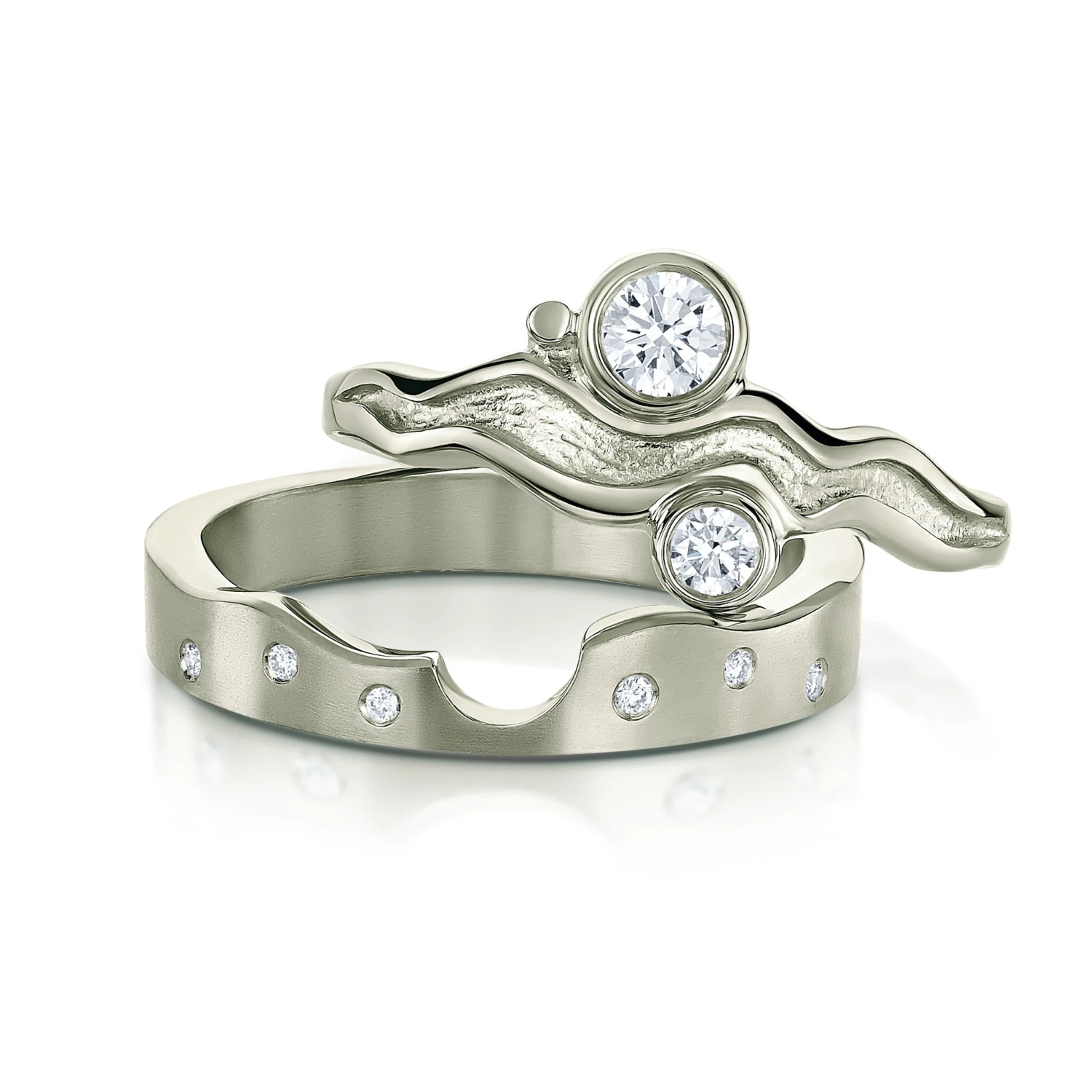 This ring set combines two of Sheila’s River Ripples diamond rings in enduring platinum. The engagement ring features a ripple-shaped design with a 3.9mm and 3mm diamond, each set by hand in our Orkney workshop. The matching wedding band showcases six small diamonds. Together the rings form a beautiful and contemporary ring set.