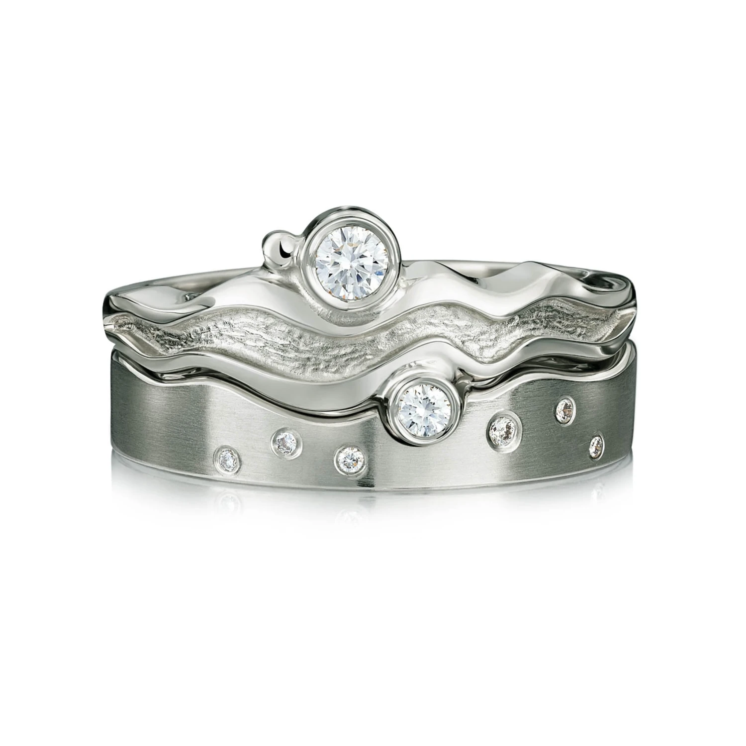 This ring set combines two of Sheila’s River Ripples diamond rings in platinum. The engagement ring features a ripple-shaped design with a 3mm and 2mm diamond, each set by hand in our Orkney workshop. The matching wedding band showcases six small diamonds. Together the rings form a beautiful and contemporary ring set.
