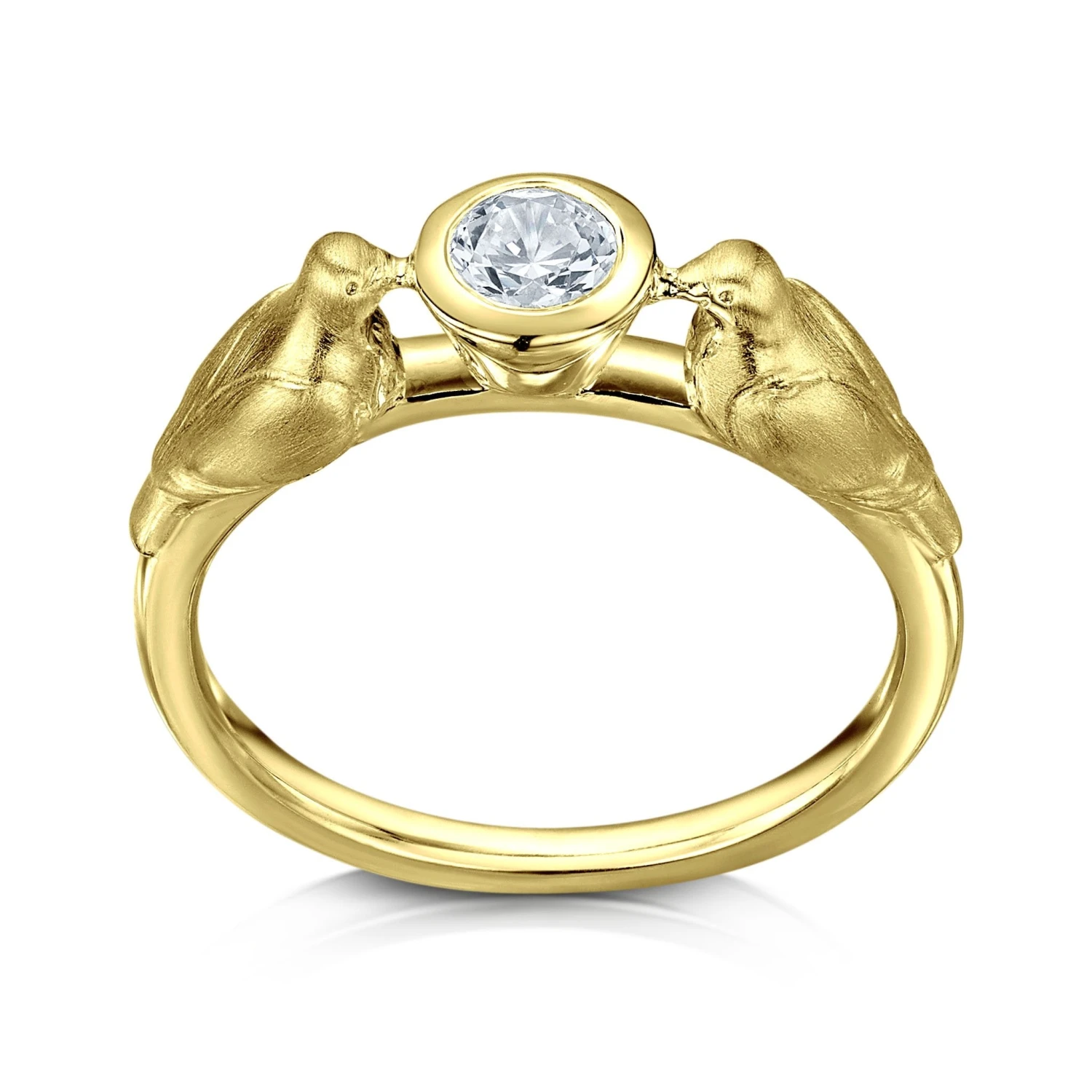 This Dove Ring in luxurious 18ct yellow gold features two doves delicately perched on a gold band, clasping a sparkling 0.25ct diamond between them. The ring is hand-finished in our Orkney workshop.