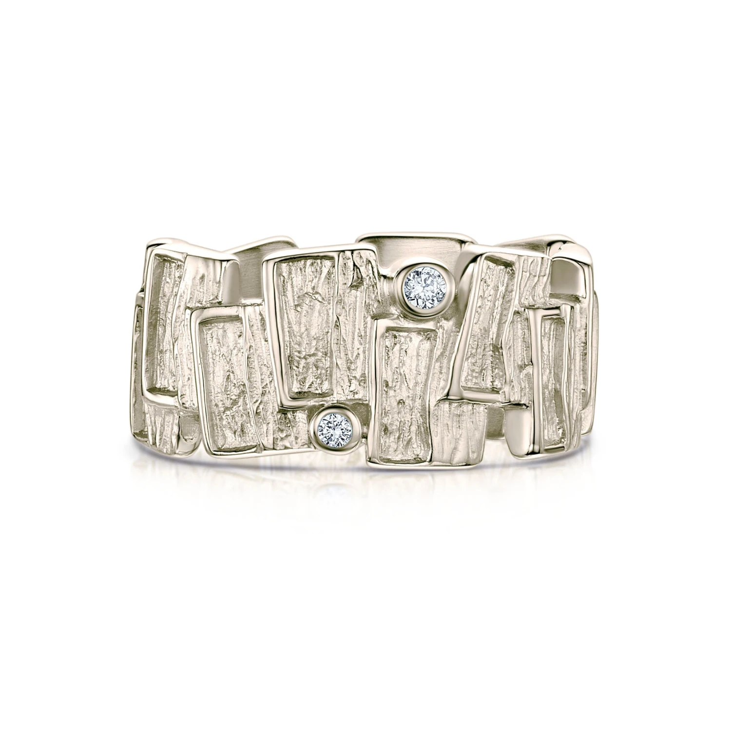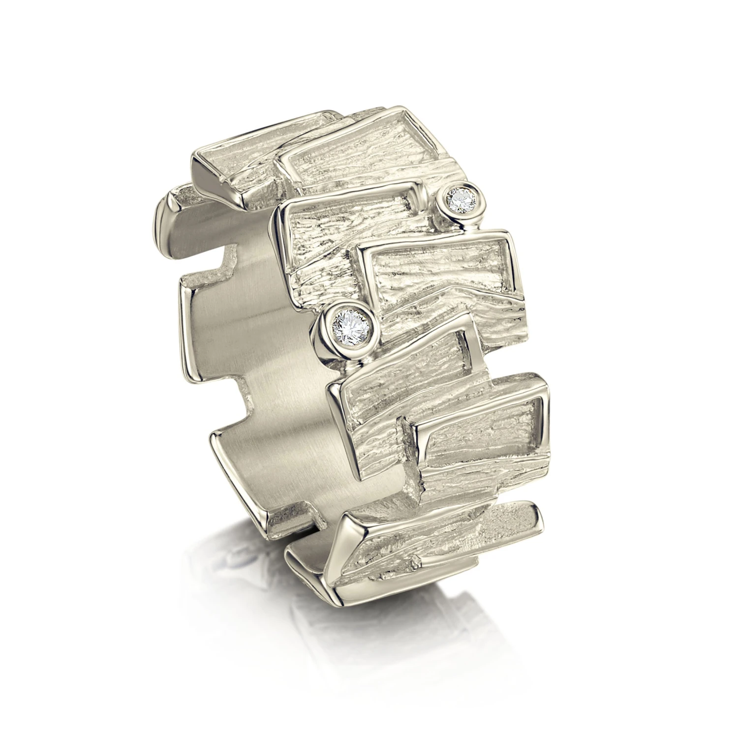 This Flagstone ring in luxurious 18ct white gold features an asymmetric band design and is enhanced with a 2mm and 1.5mm diamond, each set by hand. The design is hand-finished in our Orkney workshop.