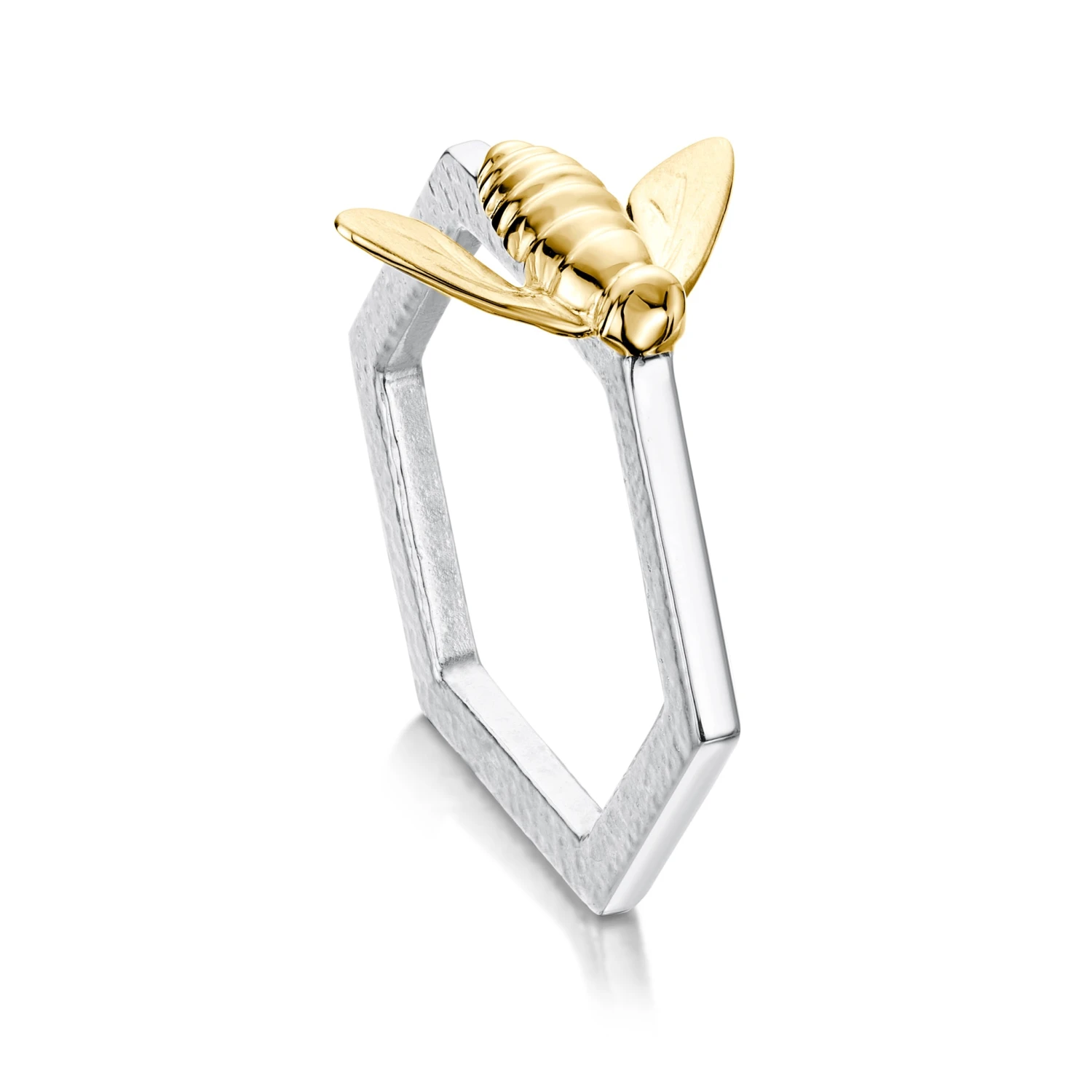 This sterling silver Honeycomb Hexagon ring features a textured surface and is complemented with a beautifully detailed 12mm wide honeybee in 9ct yellow gold. The contemporary ring is ideal for stacking and is a perfect complement to Sheila’s Honeybee jewellery collection.
