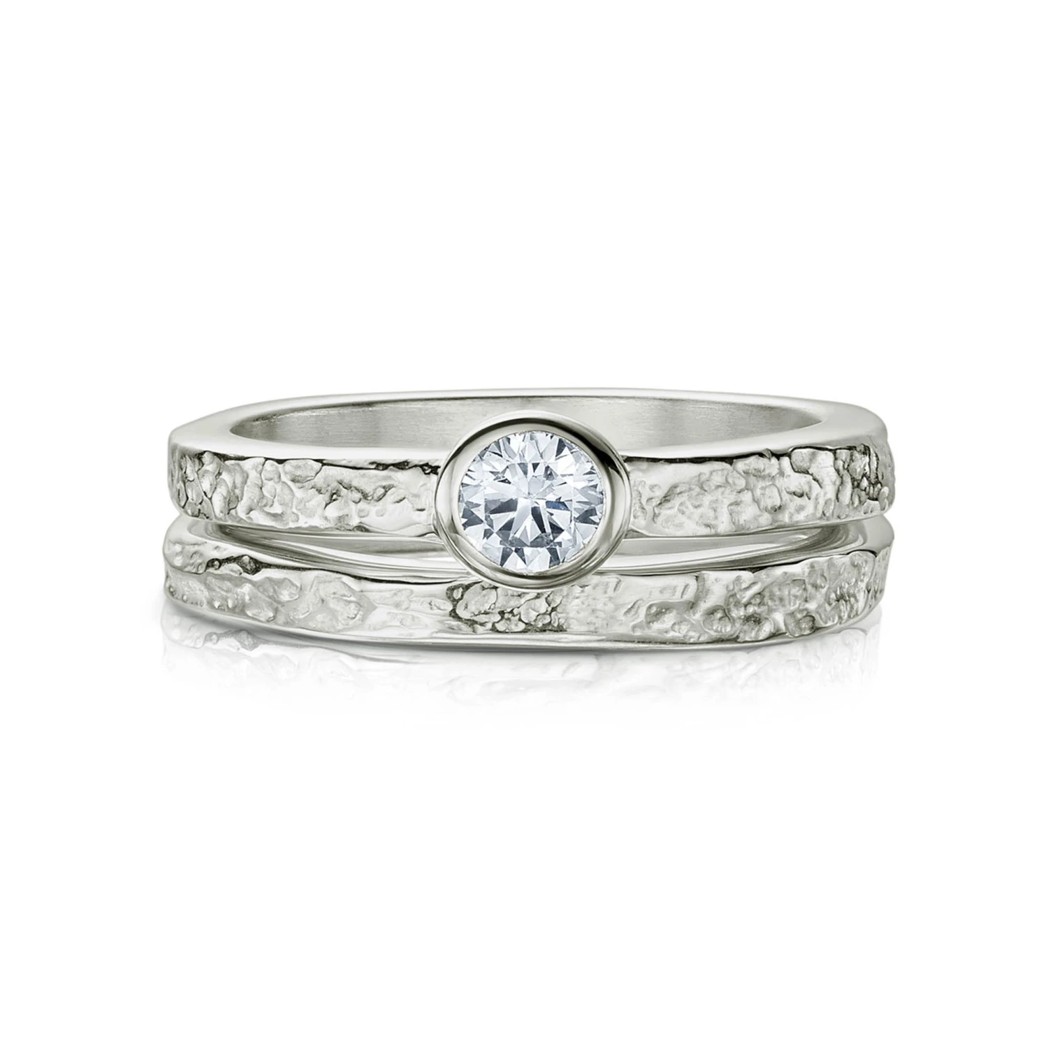 A contemporary ring set inspired by the matrix and structure of rock. Each piece is textured using a process called reticulation to mimic the appearance of rock. All of the rings in our Matrix collection are available as a plain band or set by hand with a variety of gemstones.