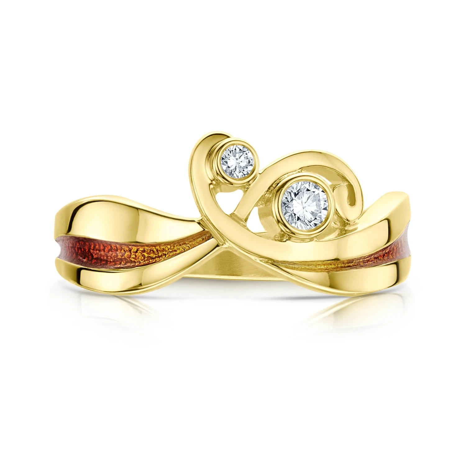 This New Wave ring in luxurious 18ct yellow gold features two curving waves, hand-enamelled in ‘Fire’ enamel. The crest of each wave is delicately finished with a diamond—3mm and 2mm—set by hand in our Orkney workshop.
