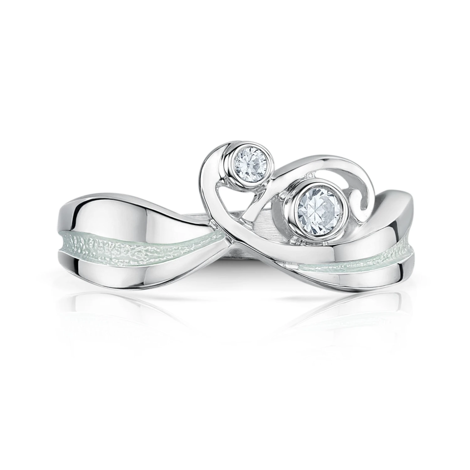 This New Wave ring in sterling silver features two curving waves, hand-enamelled in ‘Crystal’ enamel. The crest of each wave is enhanced with a cubic zirconia—3mm and 2mm—each set by hand in our Orkney workshop.
