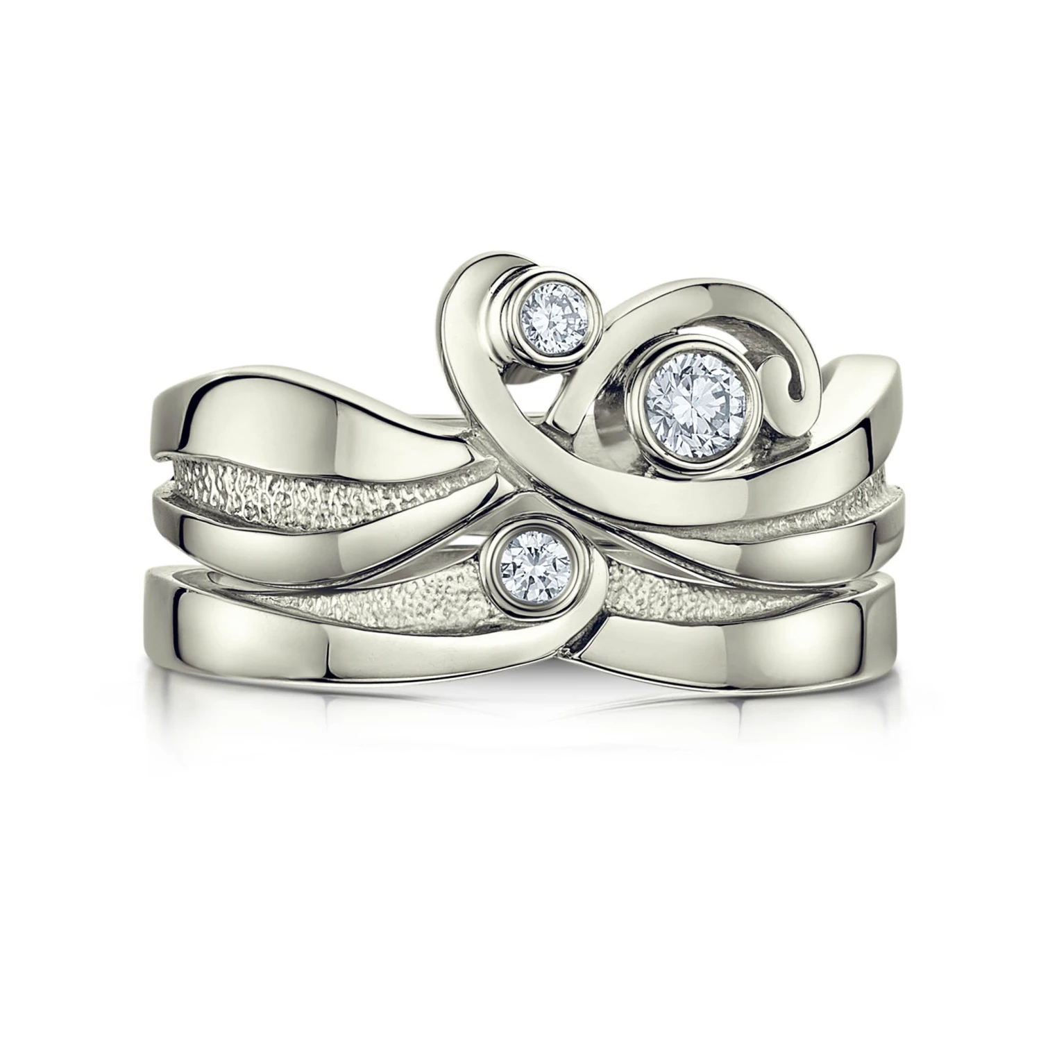 This ring set combines two of Sheila’s New Wave diamond rings in platinum. The first is her New Wave design with two curving waves, each enhanced with a diamond—3mm and 2mm—set by hand in our Orkney workshop. This ring then fits beautifully with the New Wave solitaire ring, which features a 2mm diamond.