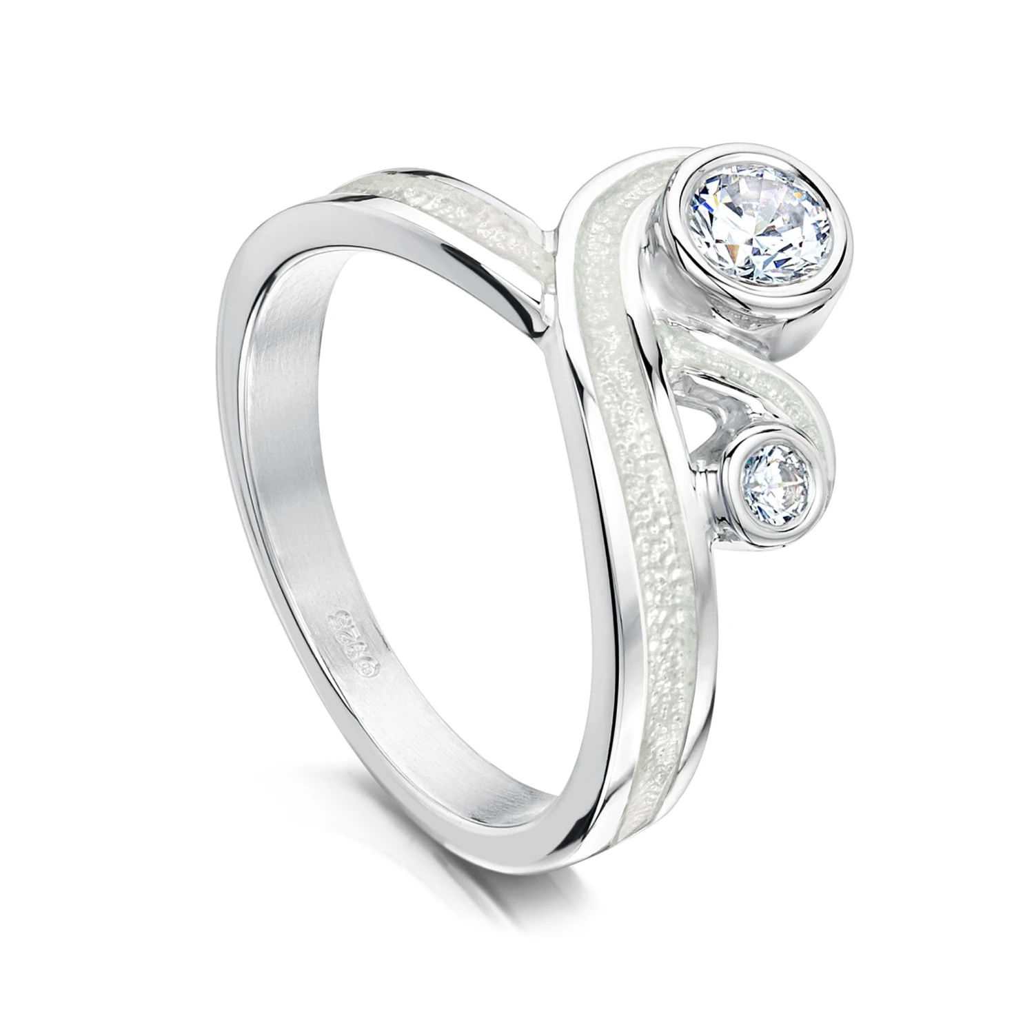 This New Wave ring in sterling silver features two curving waves, hand-enamelled in ‘Crystal’ enamel. The crest of each wave is enhanced with a cubic zirconia—4.5mm and 2.5mm—each set by hand in our Orkney workshop.