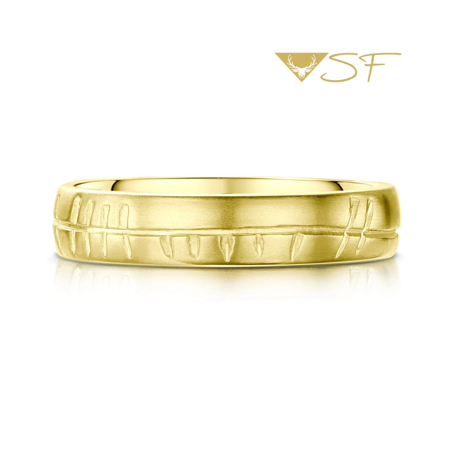 This 4mm Ogham oval court ring in rare and exclusive 18ct Yellow Scottish Gold features ancient Ogham script that reads ‘a blessing’. Scottish Gold comes from the Cononish Gold Mine in remote hills, near the village of Tyndrum in the west of Scotland. The luxurious metal is cast and beautifully finished in our Orkney workshop. The final piece is then tested by Edinburgh Assay Office before being hallmarked as authentic, pure Scottish Gold.