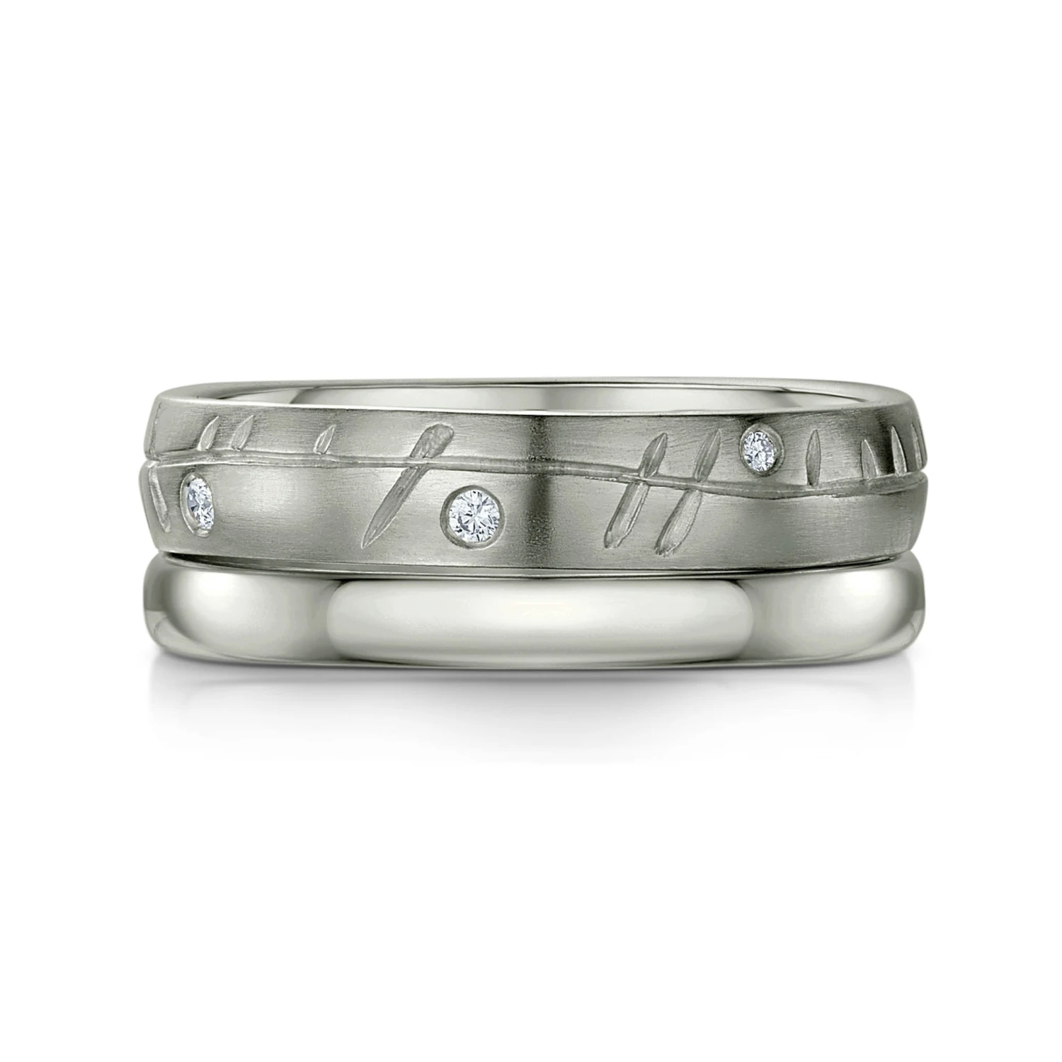 This ring set combines Sheila’s small Ogham diamond ring in platinum with her traditional 2.5mm platinum wedding ring. The Ogham ring features Ogham script that reads ‘a blessing’ and is laced with seven diamonds, each expertly set by hand in our workshop. The matching platinum band is a traditional oval court design, offering ultimate comfort with classic elegance.