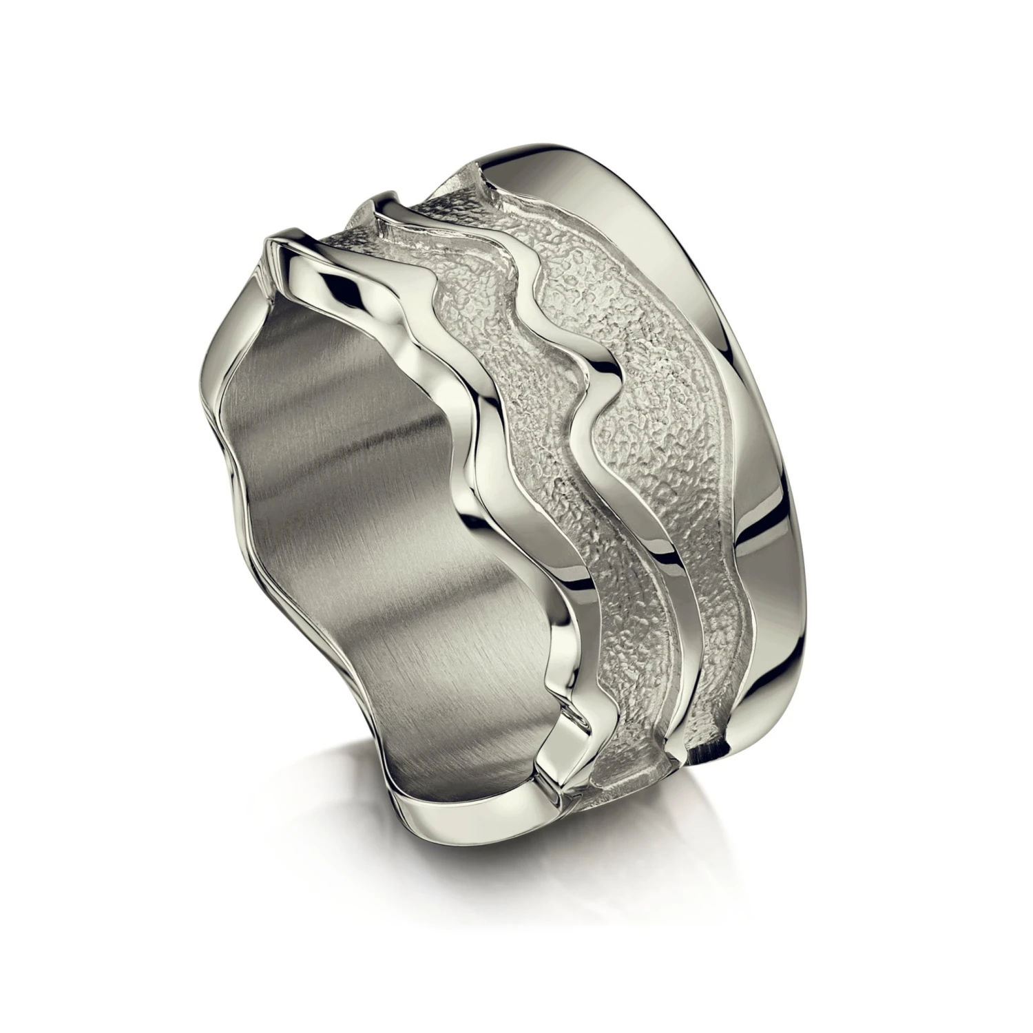 This River Ripples dress ring in platinum measures approximately 10mm at its widest, with one edge featuring a rippled design. The ring is expertly hand-finished in our Orkney workshop.