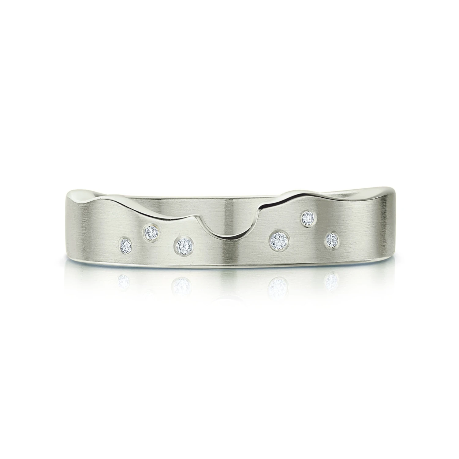 This River Ripples ring in platinum features six diamonds hand-set across the face of the ring, the design is expertly hand-finished in our Orkney workshop and fits perfectly alongside our River Ripples Engagement Ring in Platinum with Diamonds.