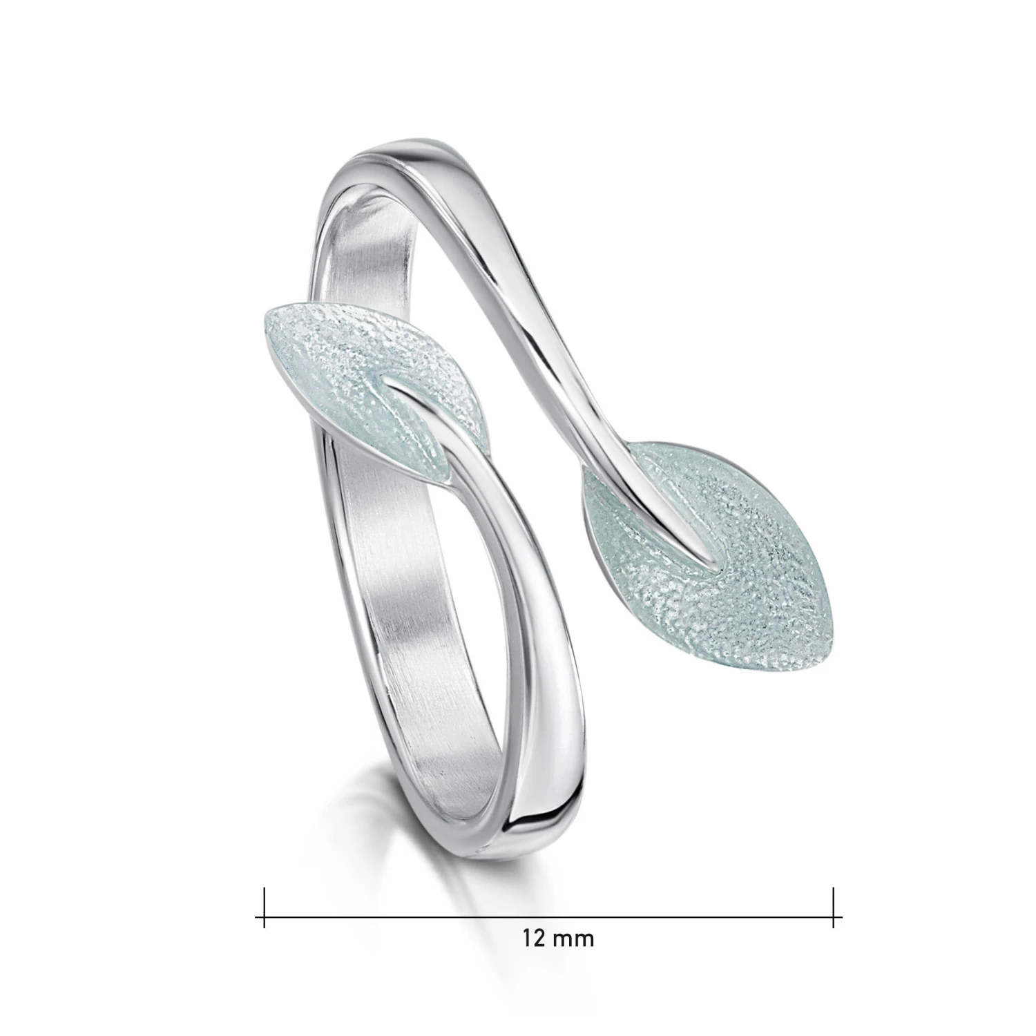 This sterling silver Rowan Ring features two intricate leaves in Frost enamel, perfectly placed on a flowing branch.