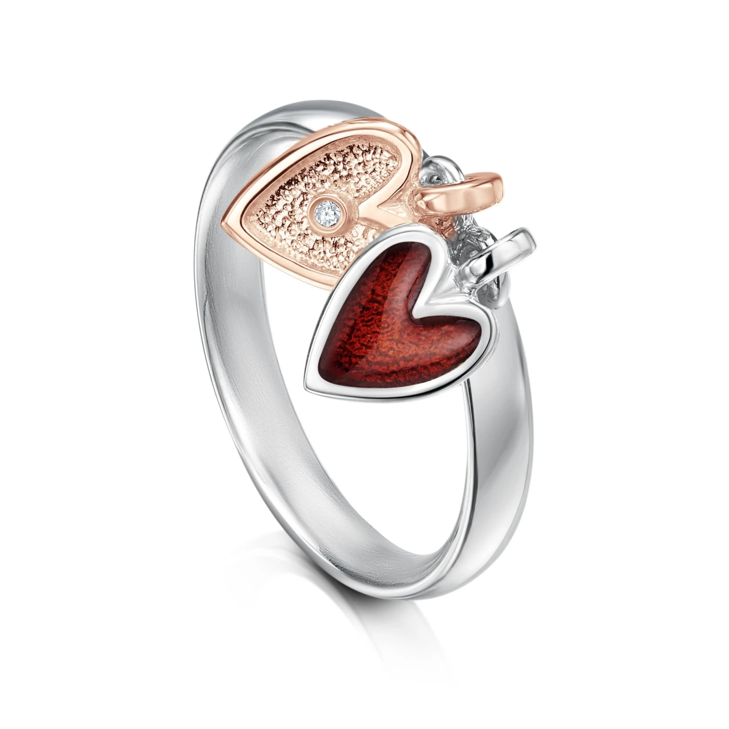This Secret Hearts ring features two hearts, one in enamelled sterling silver, the other in 9ct rose gold with a sparkling diamond. The two hearts are attached to a sterling silver band and are free to move when worn.