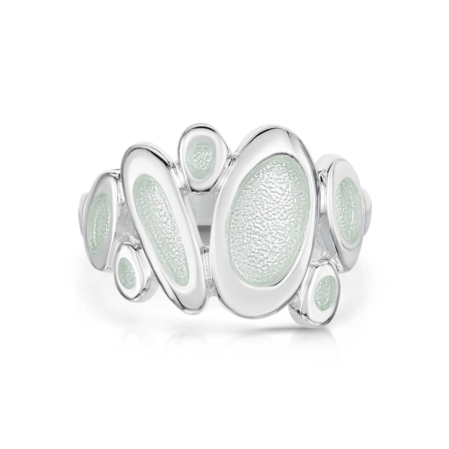 This Shoreline Pebble dress ring in sterling silver features multiple pebble shapes scattered across the width of the band. The ring is hand-enamelled in Crystal in our Orkney workshop and varies in width from approximately 2.5mm up to 12mm.