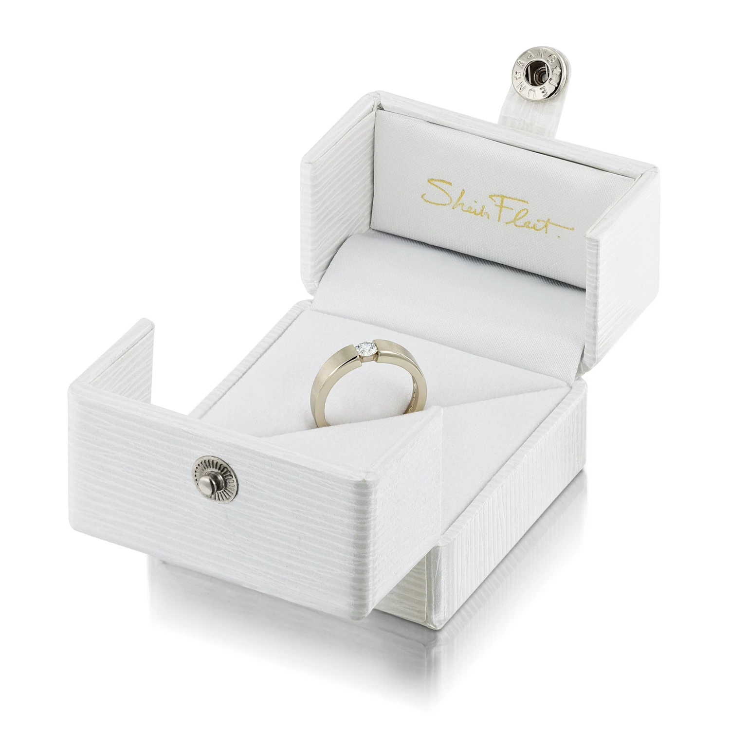 This beautiful quarter-carat (0.25ct) diamond ring in luxurious 18ct white gold is designed to mimic classic tension rings, where the diamond is clasped tightly between a tensioned band. Sheila’s design incorporates a dedicated setting for the diamond that secures the pavilion and culet of the gemstone. Seen from the front, the ring gives the illusion of a tension-set ring, but with the added safety of a dedicated setting that holds the diamond in place.