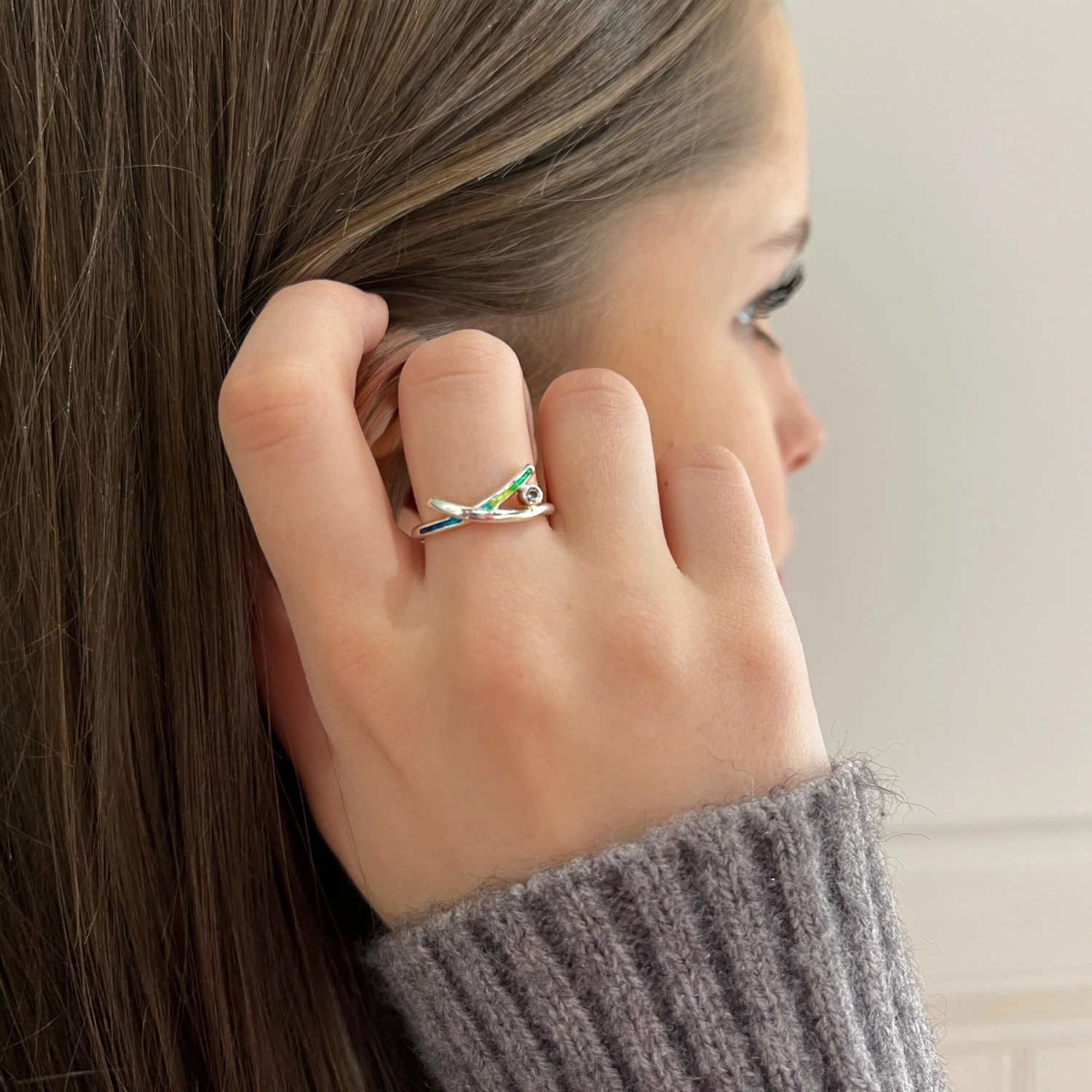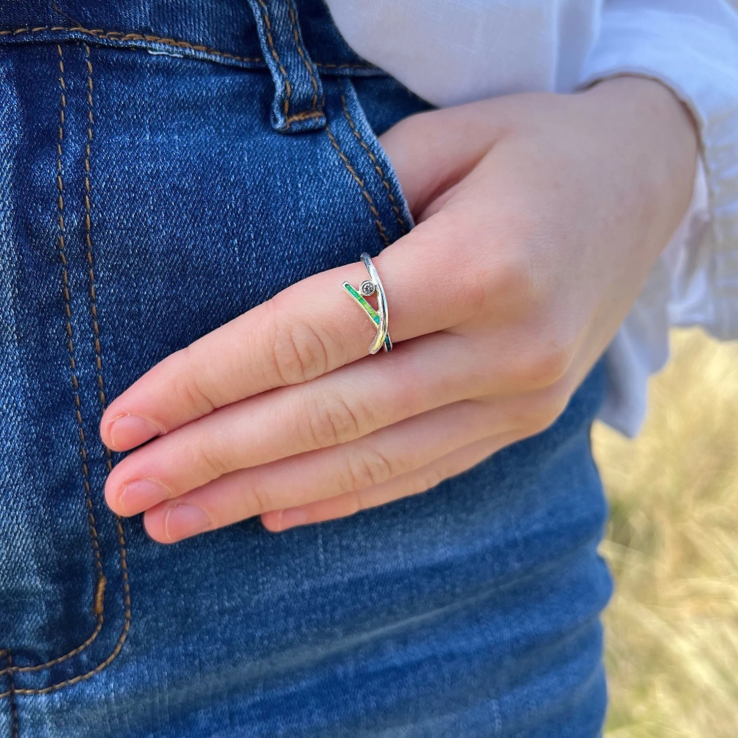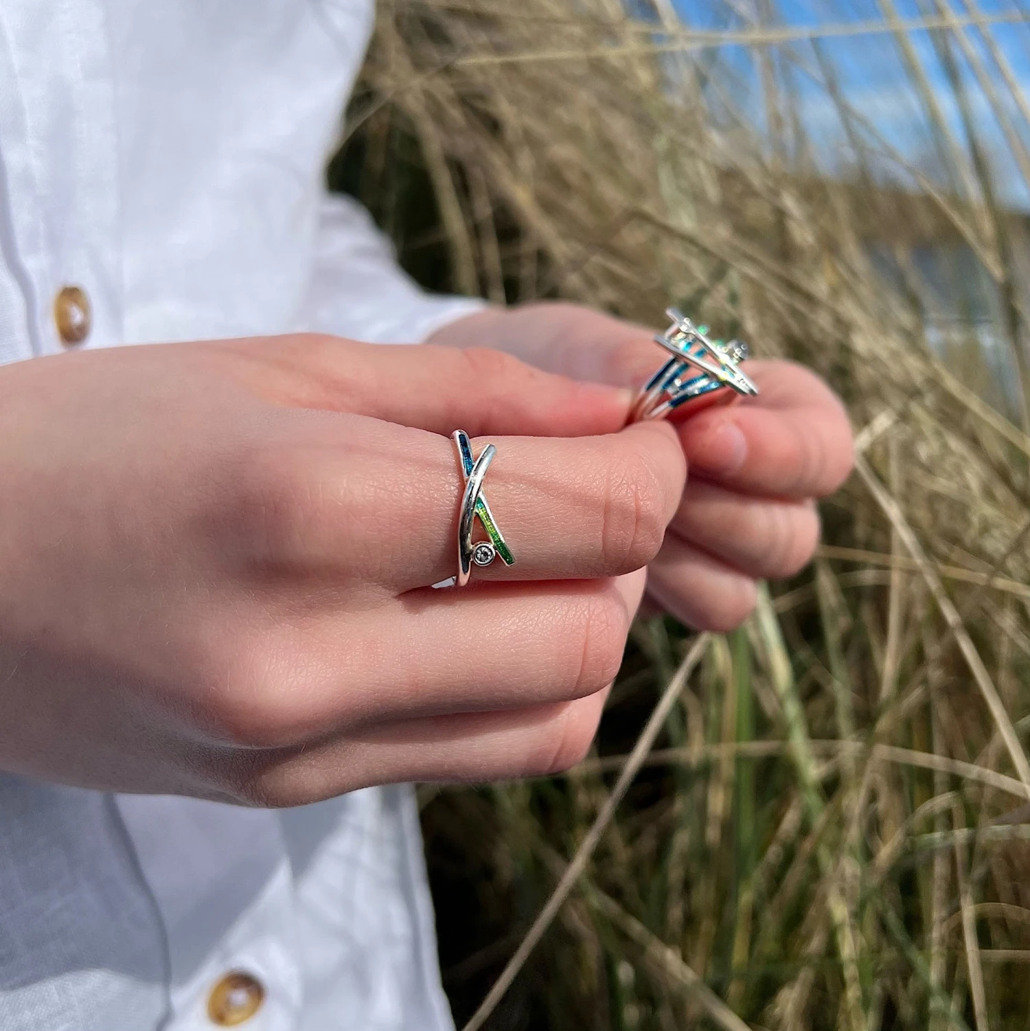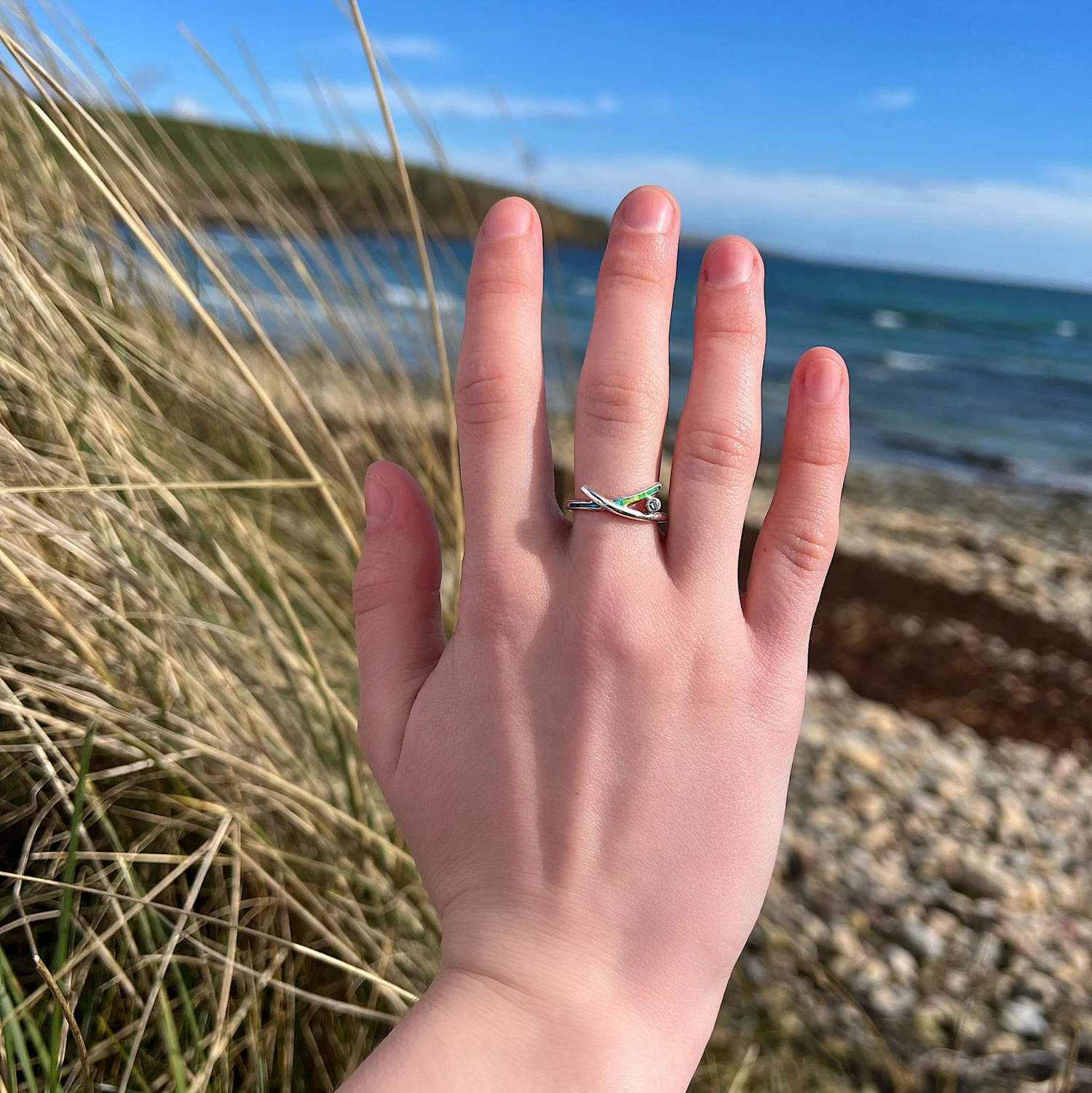 This Wild Grasses ring features a single overlapping strand of sterling silver representing the delicate form of marram grass, hand-enamelled in a variety of enamel colourways. The piece is enhanced with a single 2mm cubic zirconia, set by hand in our workshop in Orkney. The ring is enamelled in Sheila’s ‘Meadow’ enamel colourway.